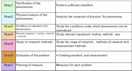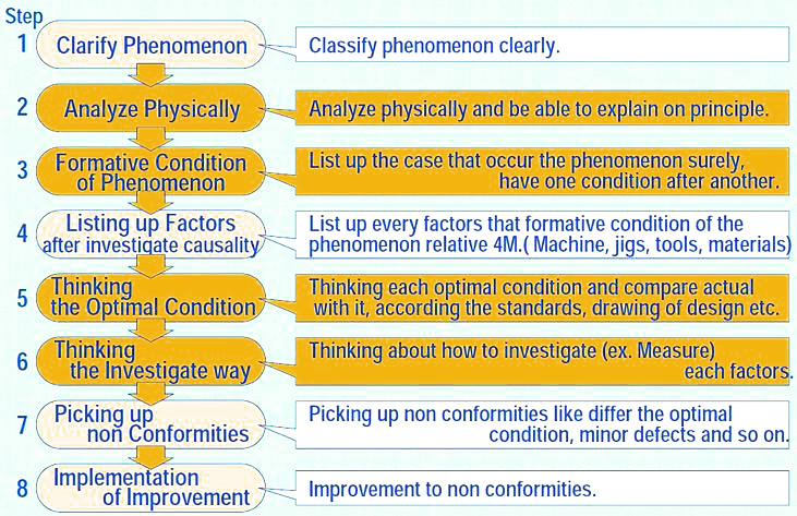 Es útil no solo limitarse a lo convencional sino buscar en los alrededores. Una vez visto esto, se estudian todas la posibilidades que han podido causar el problema, yendo actividad por actividad consiguiendo precisar en cada proceso y delimitar las interacciones entre ellos, un punto clave aquí es valorar como es el estado de las maquinas, de las materias primas y los métodos de actuación, todo ello debe inspeccionarse en el mismo puesto de trabajo.